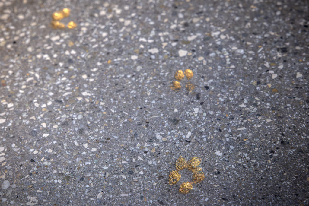 Des empreintes de renard immortalisées dans le terrazzo doré près de la billetterie.