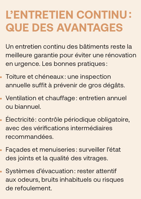 Notons que beaucoup de propriétaires considèrent encore la rénovation comme un grand chantier ponctuel. Or, elle s’apparente bien davantage à un processus continu. « Un bâtiment doit être suivi comme un organisme vivant : un check-up régulier permet d’éviter les gros problèmes », insiste Éric Maria. Les professionnels analysent généralement plusieurs éléments : la structure, l’enveloppe extérieure, les réseaux techniques, l’usage réel des pièces, les points sensibles à l’eau ou encore les systèmes de chauffage et de ventilation.